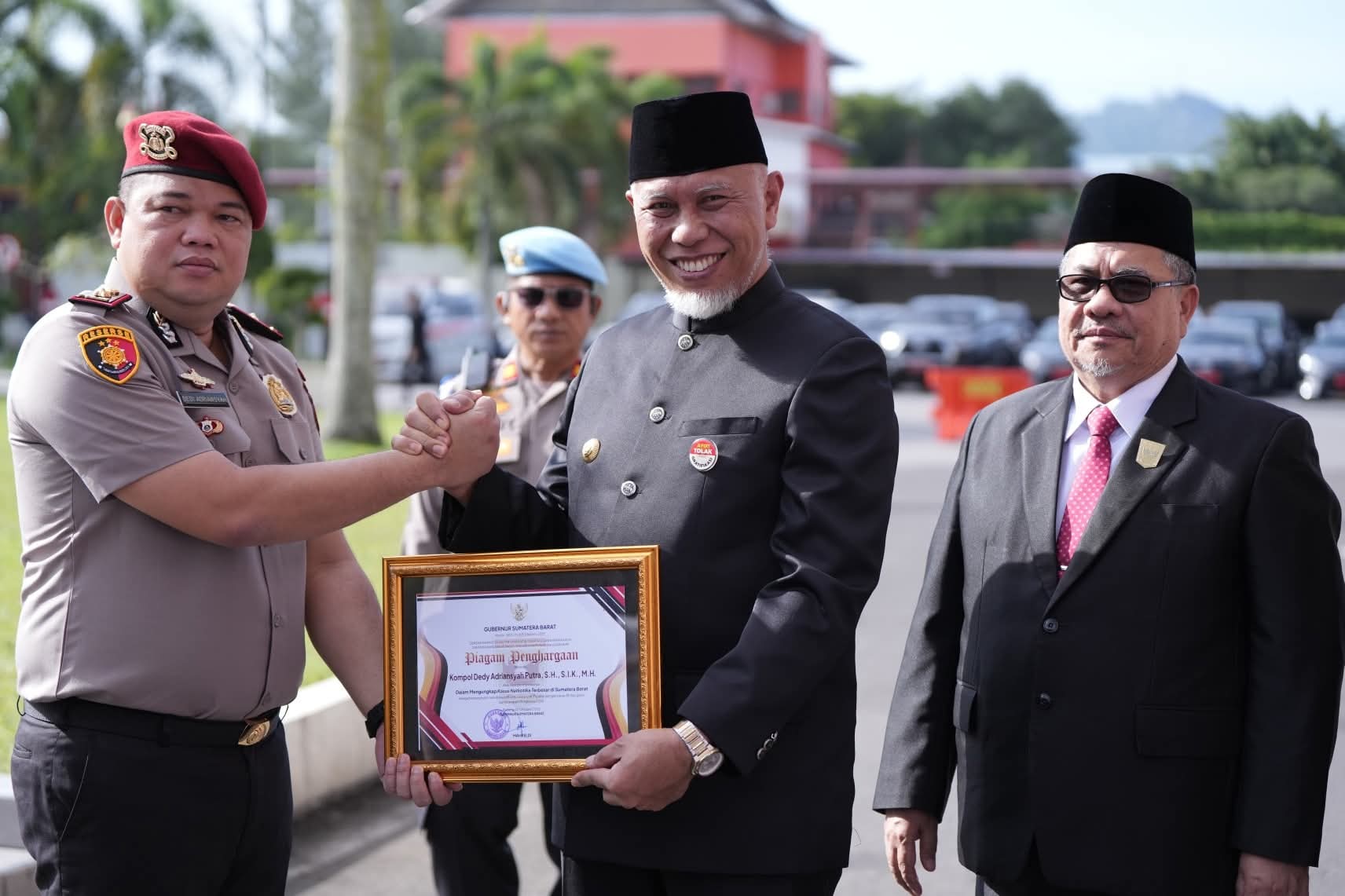 Selanjutnya Gubernur Mahyeldi menyerahkan piagam penghargaan kepada personil kepolisian Sumbar atas jasa dan prestasinya mengungkapkan kasus Narkotika terbesar di Sumbar dengan bukti Narkotika jenis sabu sebanyak 51 paket dengan berat 49.362.06 gram.